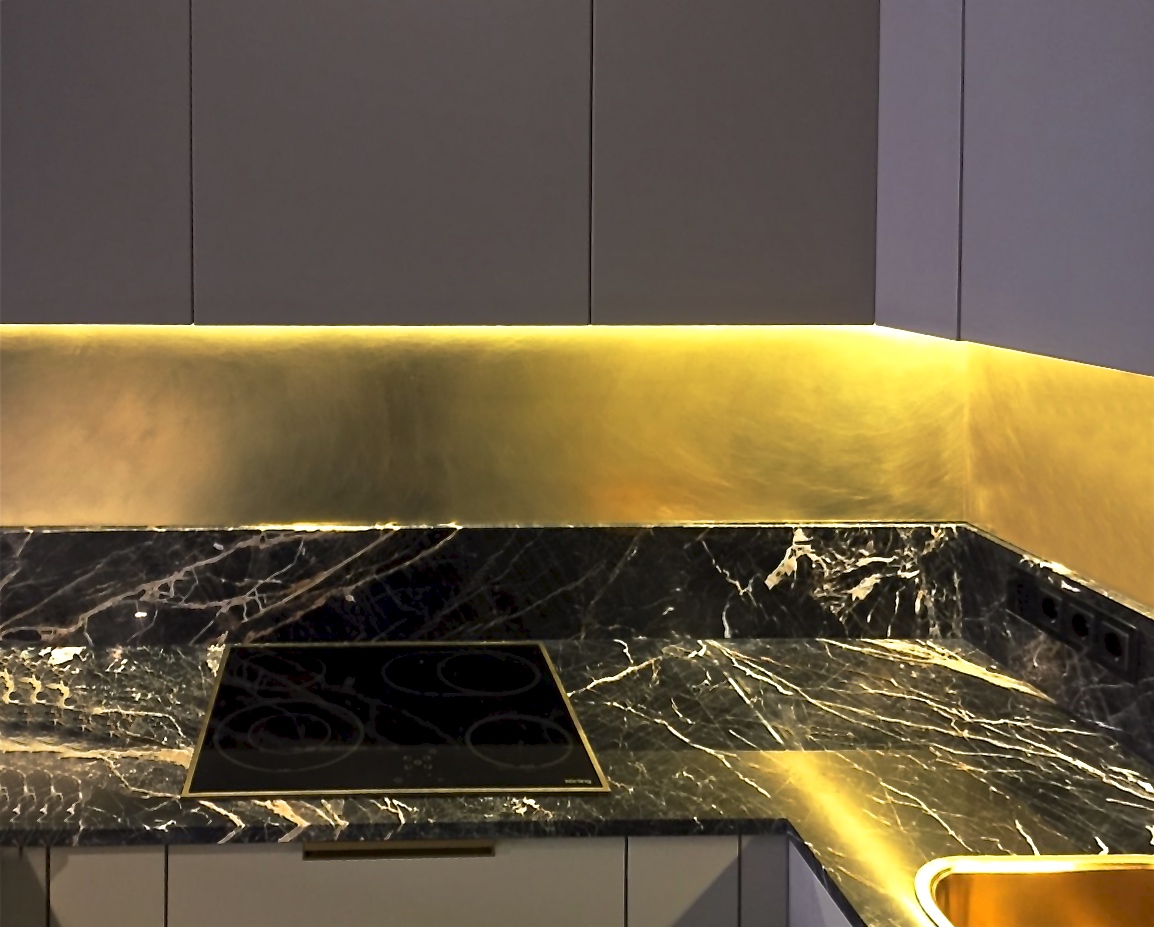 Today, copper is increasingly used in modern designs both with various decorative oxides on the surface (from black to turquoise) and without them. The bright and warm shine of real copper will certainly give comfort to your room. Copper processing options can be found in our catalog: